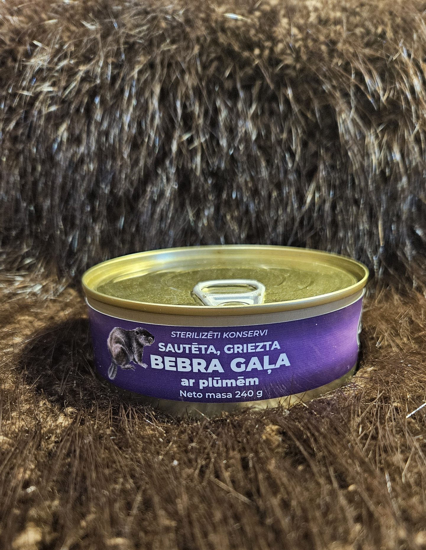Sterilizēti gaļas konservi “Sautēta, griezta bebra gaļa ar plūmēm”, SIA “Bebra spēks”, neto masa 240 grami.