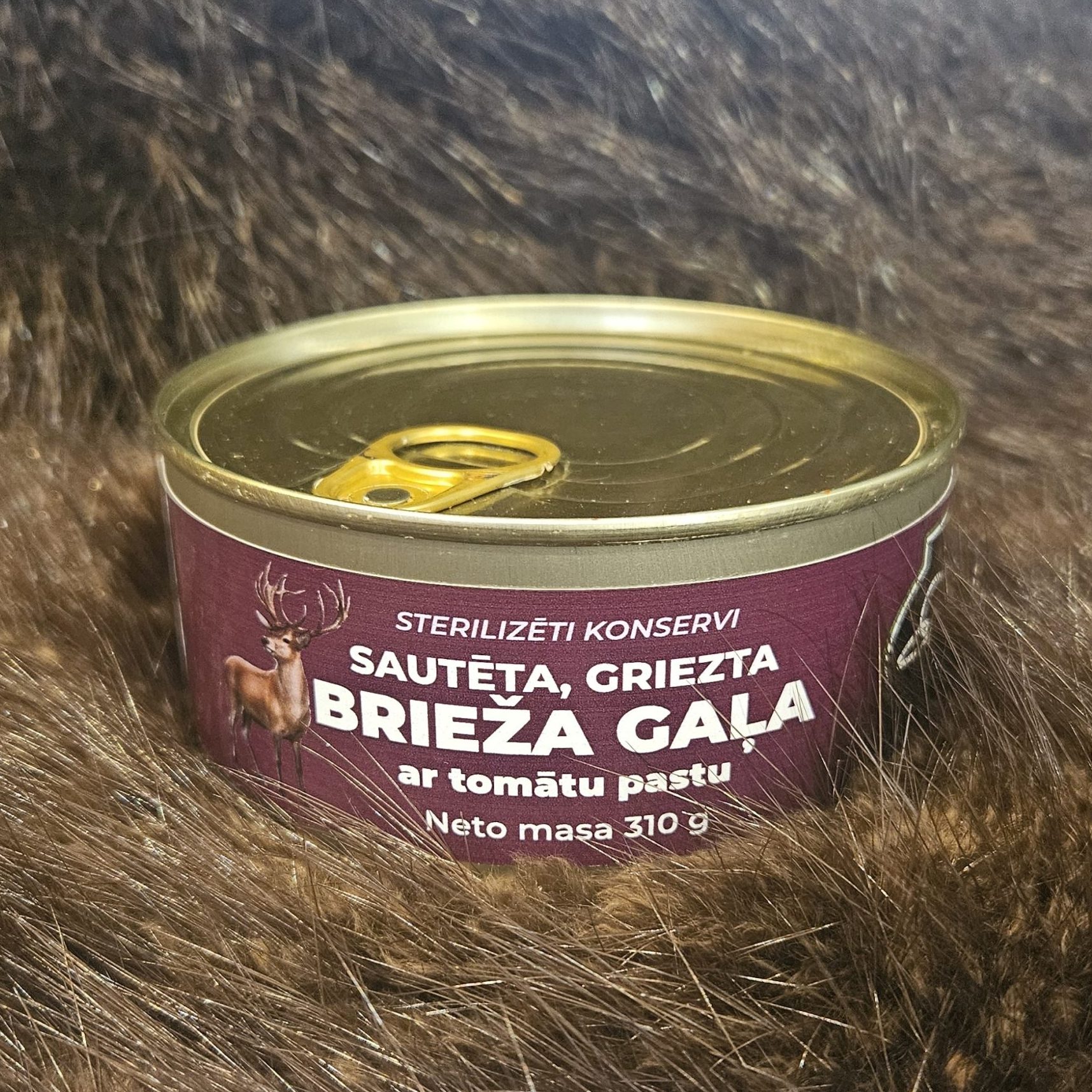 Sterilizēti gaļas konservi “Sautēta, griezta brieža gaļa ar tomātu pastu”, SIA “Bebra spēks”, neto masa 310 grami.